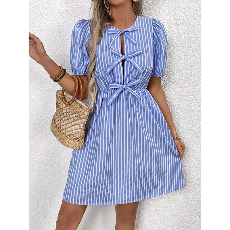 Women’s Striped Tie Front Puff Sleeve Summer Casual Mini Dresses Loose Flowy Sundress