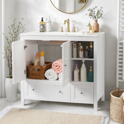 Product Description: Elevate your bathroom storage with the FCH White MDF Bathroom Vanity Cabinet —a sleek and functional solution for