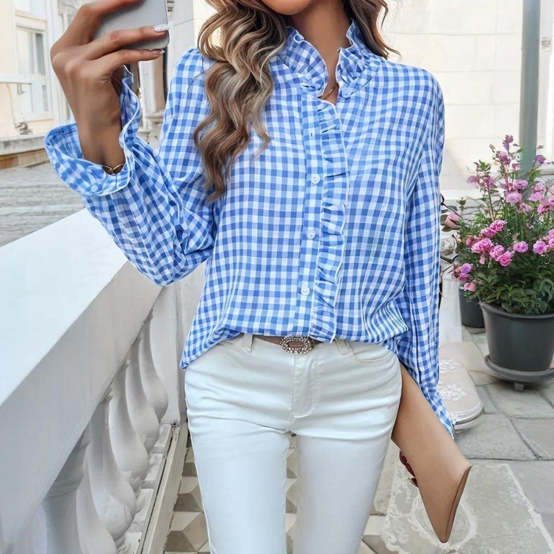 Embody effortless French sophistication with this charming checkered button-up shirt . Featuring a refined stand collar and delicate ruffled cuffs , this blouse transitions seamlessly from brunch dates to office meetings while maintaining all-day comfort.